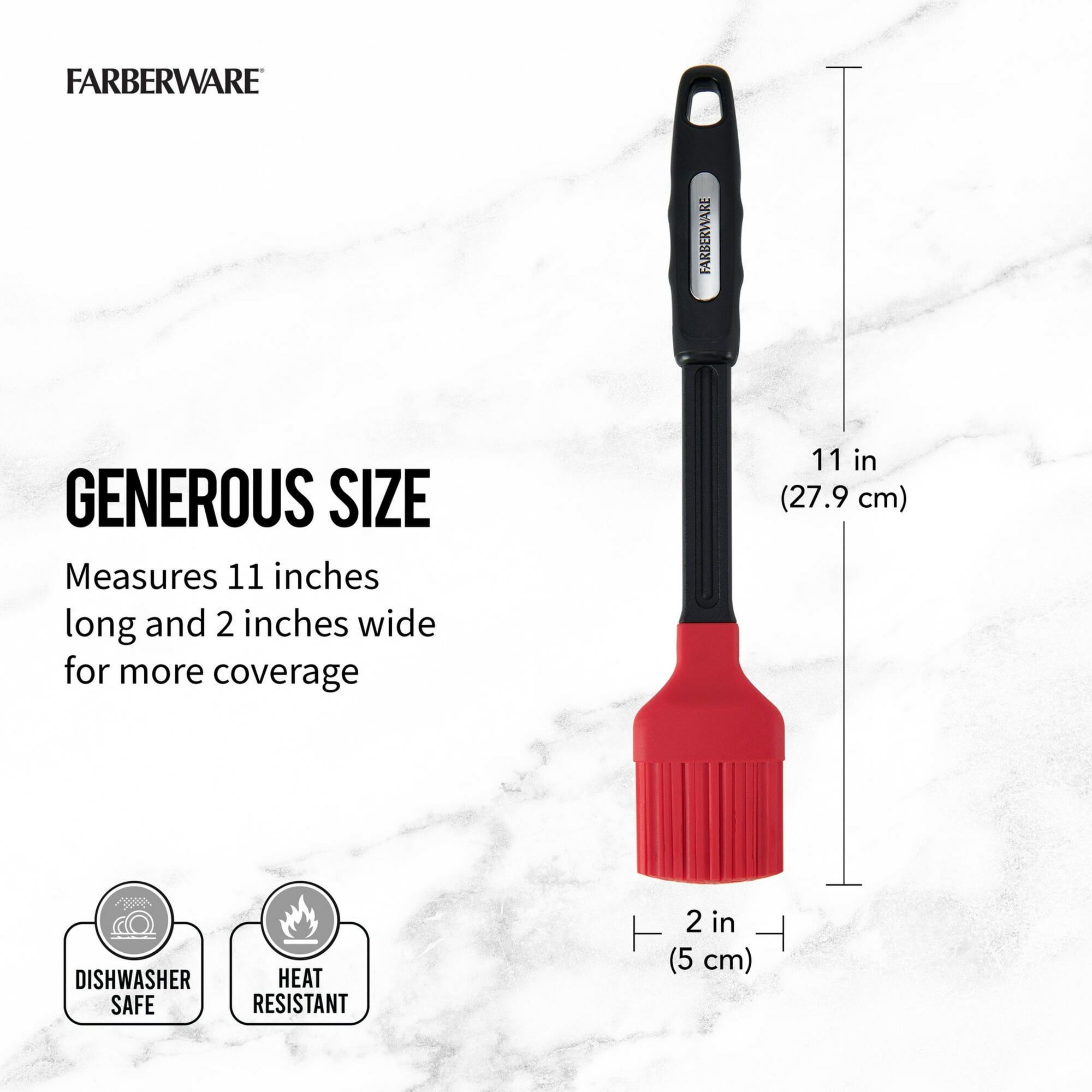 This Professional Silicone Basting Brush is great for basting roasts as they cook or for spreading melted butter onto pastries and breads on the grill or in the kitchen. The durable, flexible head is made from silicone to withstand daily use, and is heat-resistant to 500 degrees Fahrenheit. Silicone is cookware safe and won't harm pots, pans, or bakeware, including nonstick. The long plastic handle ensures hands stay away from the heat. Measures 11 inches long with a 2-inch wide head. Dishwasher safe.
